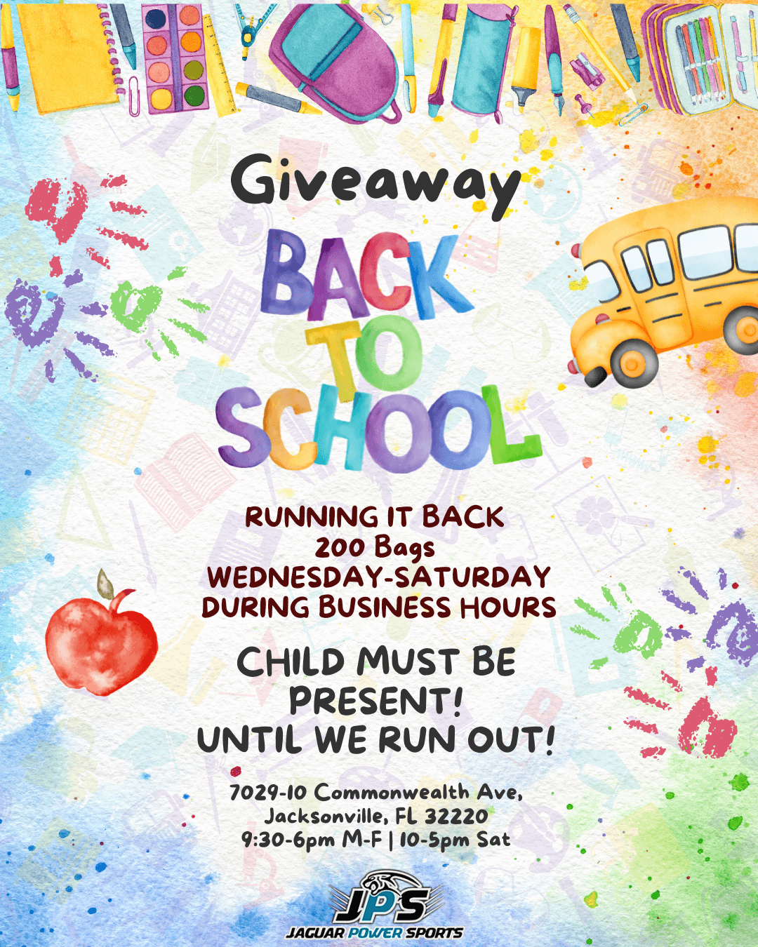 HomeHome ATVs, Dirtbikes, UTVs & moreBack to School Giveaway Extended! Back to School Giveaway Extended! We’ve extended our giveaway through Saturday during business hours only — but hurry, it’s only while supplies last! Children must be present to receive a bag. Don’t miss out! 🎒✨