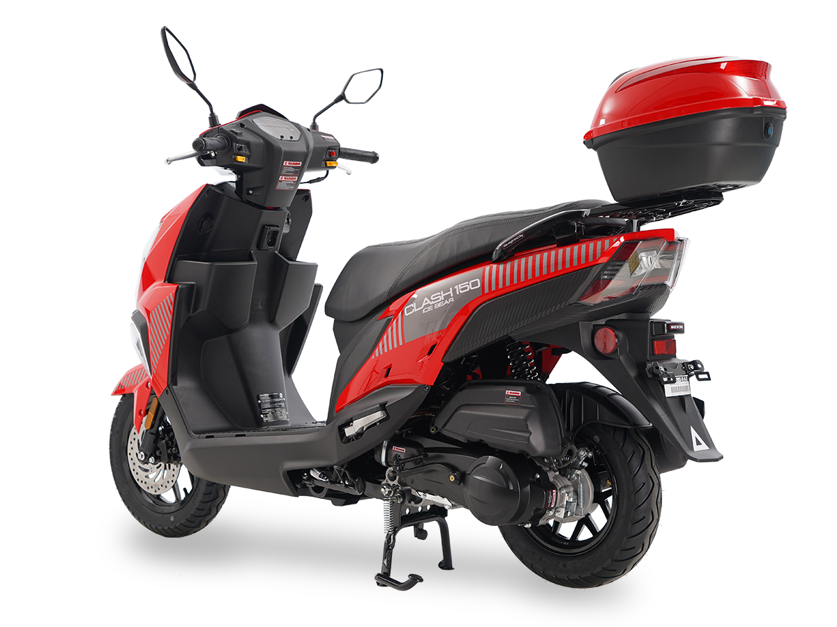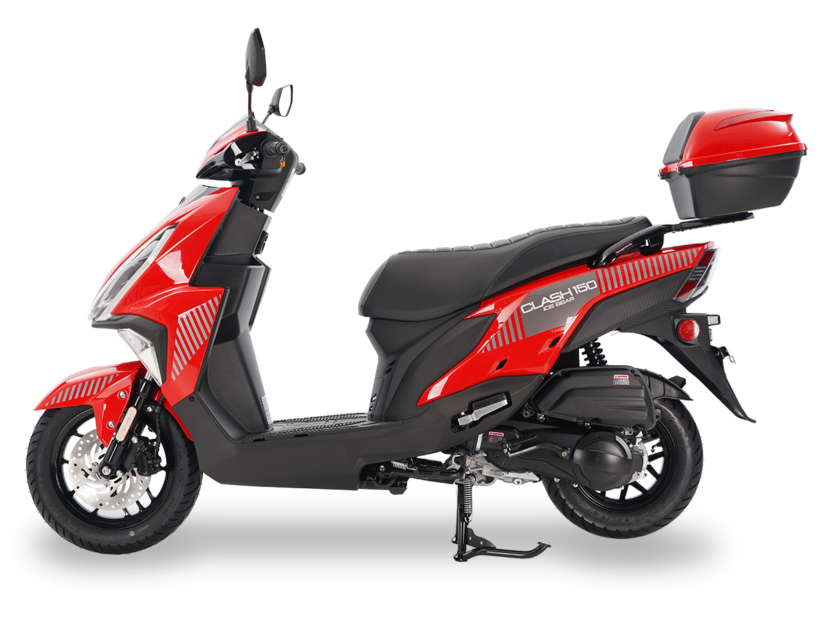 The Clash 150cc Scooter is designed for style, convenience, and efficiency, offering a GY6-150cc 4-stroke engine that delivers strong and smooth performance. Its automatic transmission provides easy operation, while the electric and kick start system ensures reliable ignition. The front disc and rear drum brakes deliver safe and controlled stopping power, and the dual telescopic forks and dual shock rear suspension provide a comfortable ride. With a 1.7-gallon fuel tank, a weight capacity of 331 lbs, and 5.12 inches of ground clearance, this scooter is practical and efficient. Additional features include a trunk, mirrors, horn, odometer, and speedometer, making it an excellent choice for daily commuting and recreational riding.