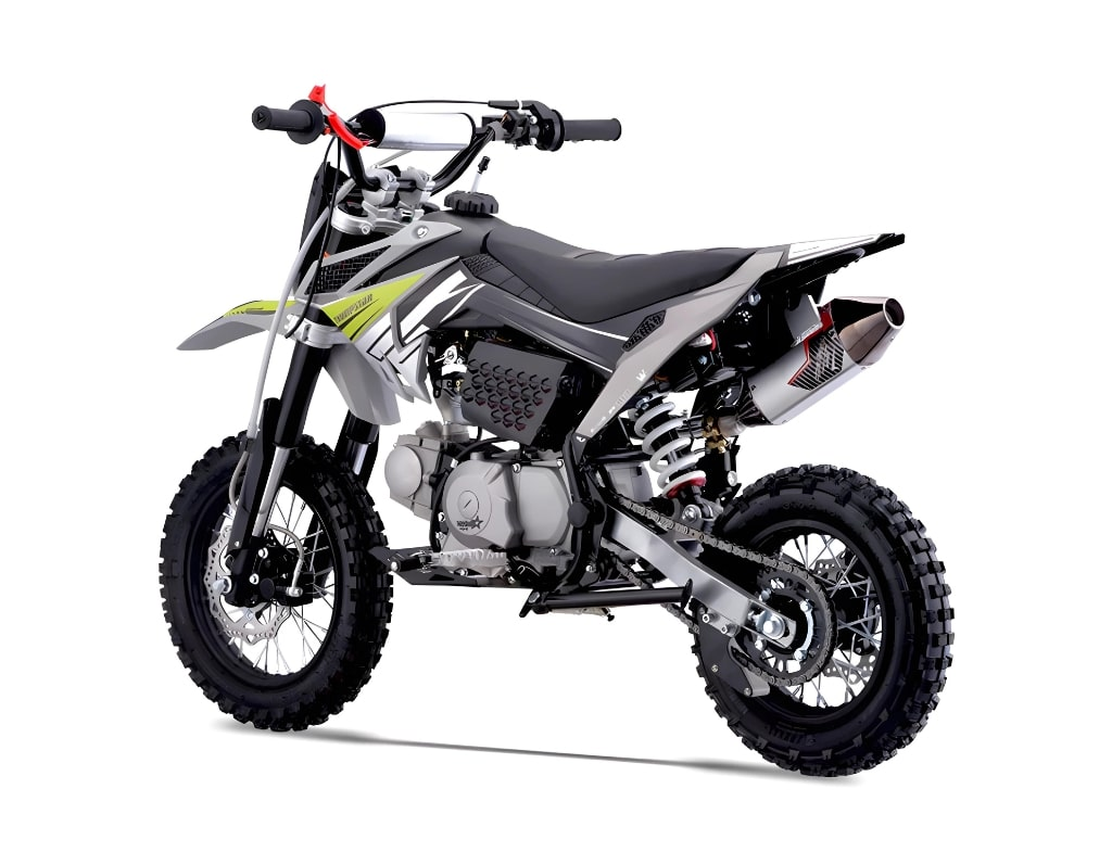 Upgraded with a Pipe Bomb DW2 28mm exhaust and header bomb, it offers a throaty sound and enhanced airflow for improved performance. Its steel rims with 12″ front and 10″ rear tires provide solid grip, and the suspension system—600mm front inverted forks and 280mm rear shock—is dialed for smaller riders. A 27″ seat height fits a broad range of youth sizes, while disc brakes on both wheels ensure quick stops. It’s a smooth, stylish ride made for learning and leveling up.